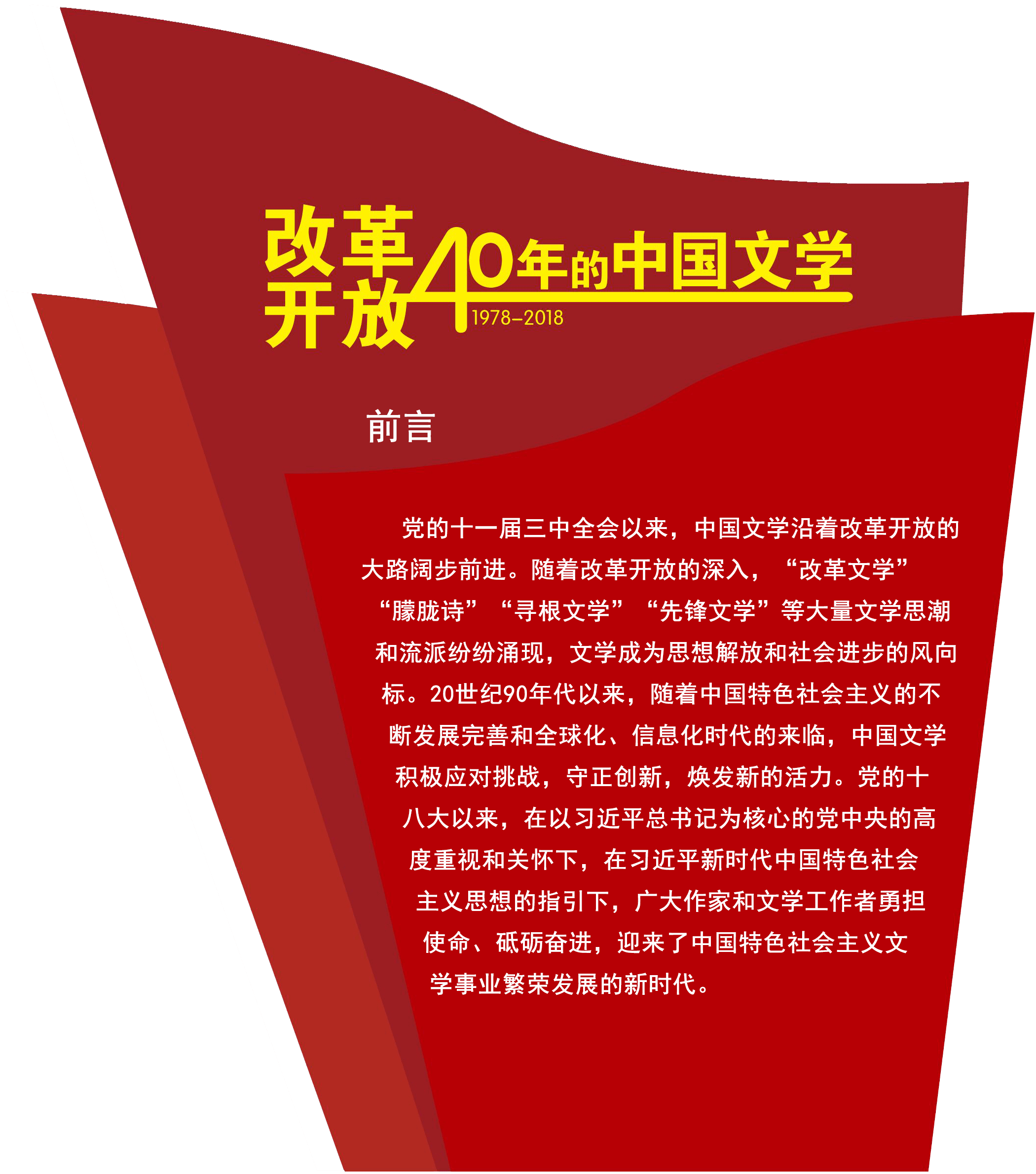 改革開放40年,是當代文學加快自我更新和發展腳步的40年。中國作家置身全球化背景和現代化進程,在外來文藝思潮此起彼伏、文學觀念不斷更迭中大膽“拿來”,勇于探索,在不斷創新、汲取營養中又能夠始終立足本土站穩腳跟……