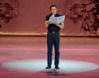 在昨晚的誦讀會現場,桐鄉市作家協會主席陳偉宏正在誦讀自己的原創詩歌。