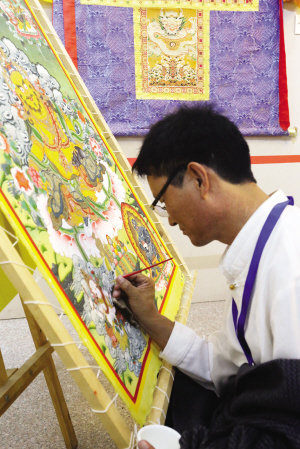 來自青海的唐卡畫師現(xiàn)場繪制唐卡。