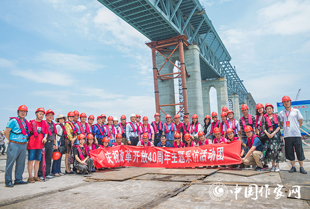 采訪團采訪公鐵大橋建設(shè)指揮部并在建設(shè)中的公鐵大橋上合影