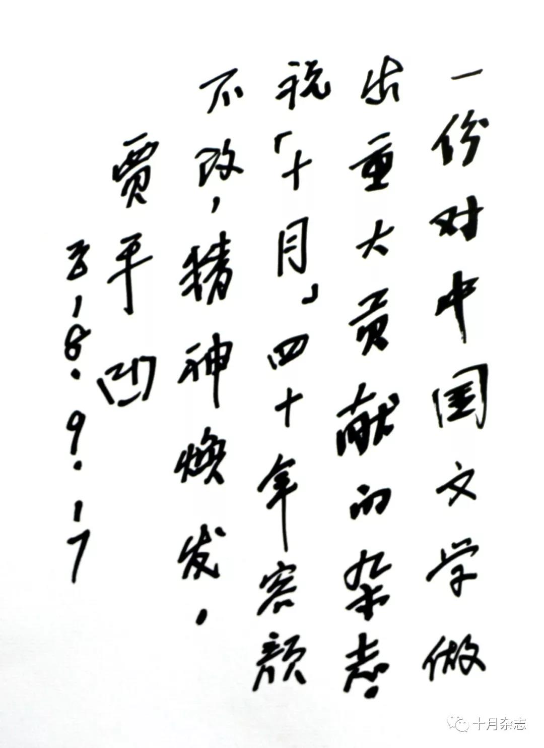 最后賈平凹祝福《十月》創(chuàng)刊四十周年,并題字:“《十月》是對(duì)中國(guó)文學(xué)也做出了巨大貢獻(xiàn)的雜志,祝《十月》四十年容顏不改,精神煥發(fā)。”