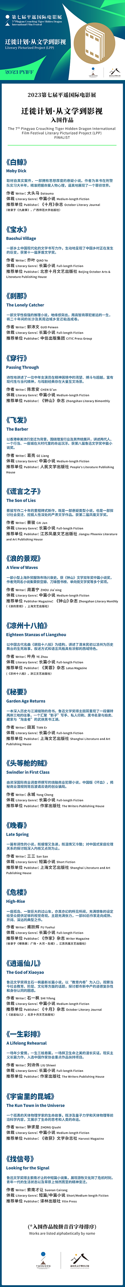 入圍作品囊括了近三年極具影視改編潛質(zhì)且尚未進行任何影視化開發(fā)的文學精品,以中、長篇小說為主,涵蓋懸疑、喜劇、犯罪、科幻、愛情、歷史等多種類型。