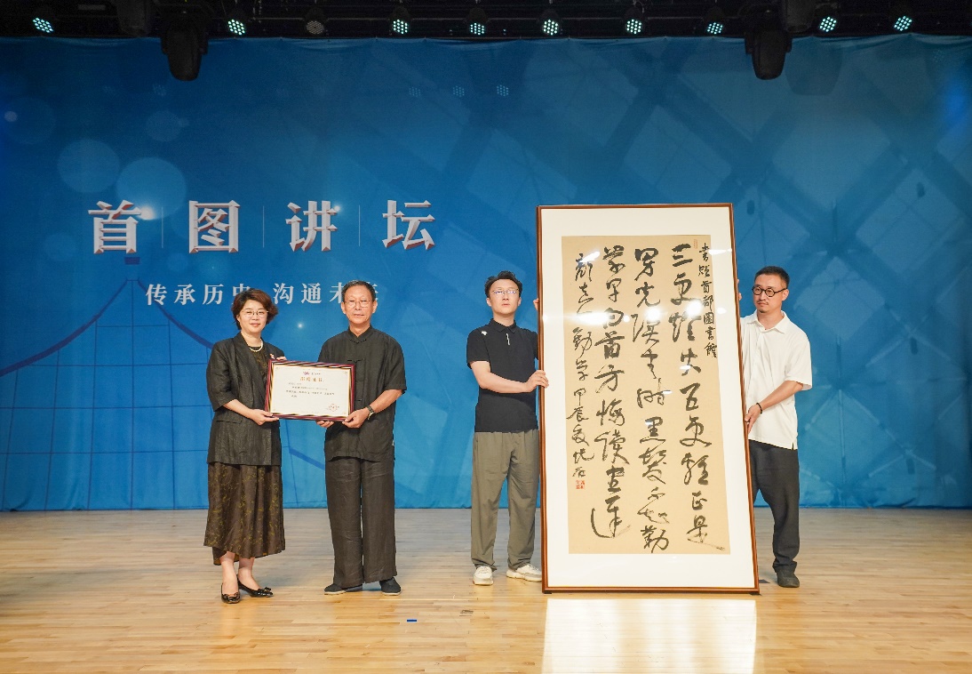 分享會后,吳悅石對出席發(fā)布會的社會各界嘉賓表示感謝,他強調(diào)石鼓文乃中華文明經(jīng)典瑰寶,素有“籀篆之祖”之譽,批注石鼓文實因書畫研習(xí)所需——學(xué)書習(xí)畫必溯石鼓。然初學(xué)時苦于字形難辨、文意難解,遂決意逐字考釋。幸遇文字學(xué)、考古學(xué)新成果涌現(xiàn),終能以今人可解之語完成批注。惟愿后學(xué)能看懂、學(xué)通石鼓文。今歷經(jīng)十年書稿問世,絕非個人之功,實乃古文字學(xué)界滋養(yǎng)使然。愿此書能引諸君沉潛經(jīng)典:于坐臥行止間認(rèn)真體悟,以身心相印的功夫深研傳統(tǒng)。活動的最后,吳悅石先生將書法作品《勸學(xué)·顏真卿》捐贈給首都圖書館,為這場兼具深度與溫度的文化盛宴畫上圓滿句號。