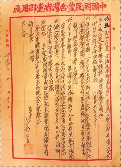 從1946年6月起,丘念臺奔走于各市縣,邀集各地知名人士15人組成“謝恩團”,由省議員林獻堂擔任團長。此信就是“謝恩團”臨行前夕,丘念臺為籌劃安排出發事宜給臺灣抗日義士姜紹祖之子、新竹縣參議員姜振驤所寫的信函。信中,從出發行程到團員個人資料準備,再到個人旅費匯寄,各項細節都做了精心安排。