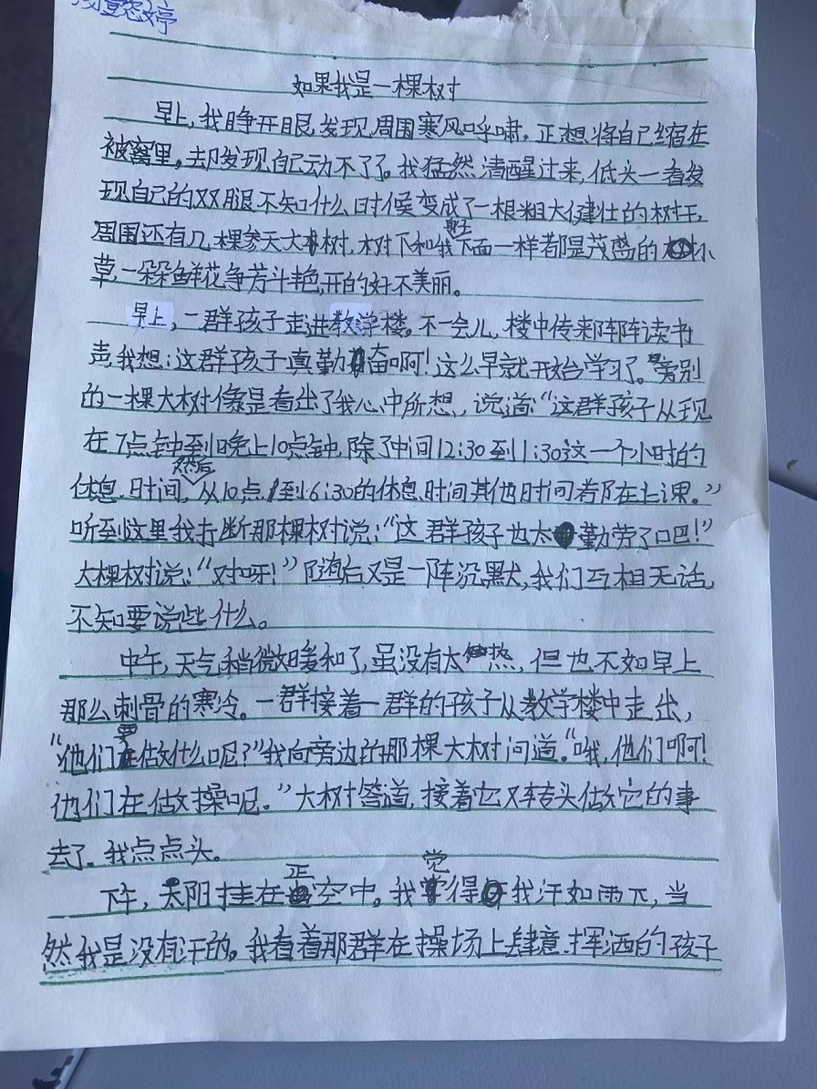 這是左昡的“創作實驗”:她帶著孩子們觀察樹、觸摸樹,有的孩子甚至嘗試了啃樹皮……在嘻嘻哈哈的打鬧中,孩子們的感官世界被打開,與大自然相擁。回到教室,她在黑板上寫下作文題:如果我是一棵樹。孩子們瞬間安靜下來,教室里安靜到只聽見紙筆摩擦沙沙的聲音。