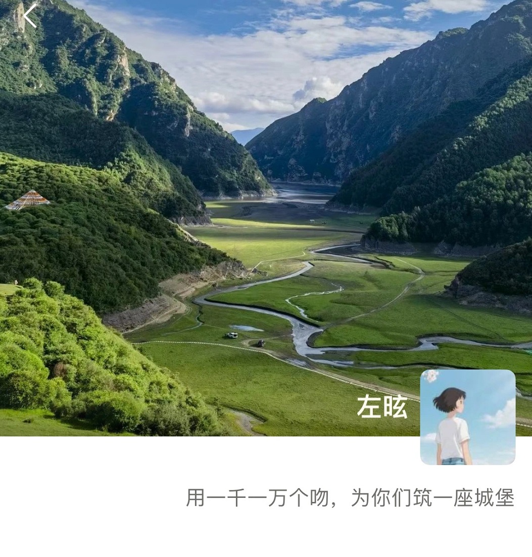 點開左昡的朋友圈,她的背景圖展示的是四面環山中的蜿蜒公路,這是臨潭冶力關的風景。底下的簽名寫道:“用一千一萬個吻,為你們筑一座城堡。”