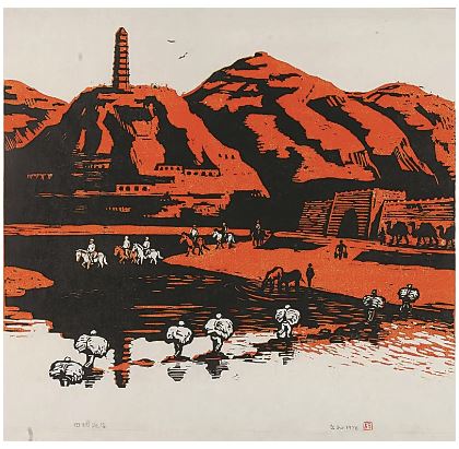 古安村:1991年底,古元被確診為癌癥晚期。20世紀90年代,古元不僅創作了一批黃河題材作品,還創作了一批駱駝題材作品。實際上,這些創作都是他在術后對人生和自我的重新審視。人生既有美好安靜的順流,也有異常艱難的逆流、漩渦和淺灘。在創作《激流勇進》時,古元已歷經四次化療,身體極度虛弱。然而,他以頑強的意志力堅持創作,通過描繪黃河漩渦與逆流而上的纖夫等意象,藝術化地傳達了其戰勝病魔的精神信念。此時,他還創作了《西出陽關》等駱駝題材作品,刻畫了駝隊在荒漠風沙中艱難跋涉的視覺意象,同樣呈現出古元強烈的精神訴求。駱駝題材作品與黃河題材作品彼此呼應,共同體現了古元晚期創作中的生命哲學思考。駱駝堅韌前行的精神、黃河激流勇進的精神,不僅體現了古元個人的生命哲學思考,也升華為對民族精神與抗戰記憶的藝術詮釋。