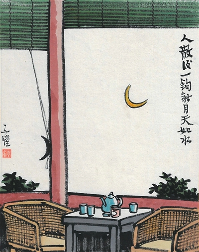 之所以是“古詩新畫”,在于豐子愷在研讀古代詩文時,真切感受到其穿越時間的魅力。宋代蘇軾提出“詩畫本一律”之說,明確了詩畫相通的理論。豐子愷在《畫中有詩》自序中談道:“余讀古人詩,常覺其中佳句,似為現代人生寫照,或竟為我代言。蓋詩言情,人情千古不變,故好詩千古常新?!本拖衿涑擅鳌度松⒑螅汇^新月天如水》,就源于宋代詞人謝逸《千秋歲·詠夏景》中的最后一句。