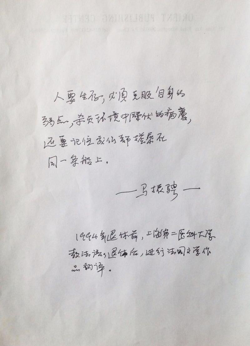 “1994年退休前,上海第二醫科大學教法語,退休后,進行法語文學作品的翻譯?!边@是法語文學翻譯家馬振騁對自己的簡樸介紹。